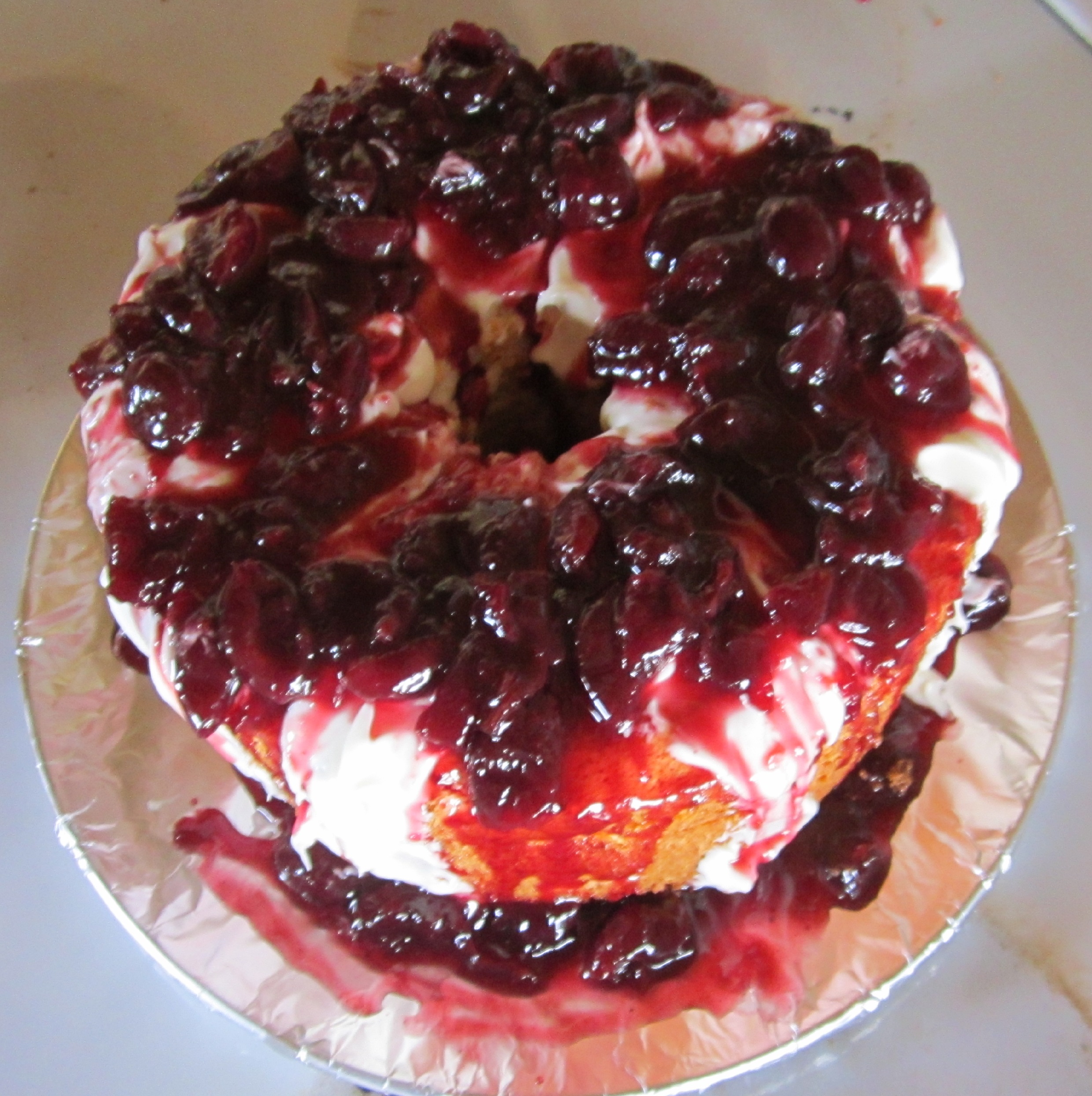 I melted some white chocolate and poured in over the cake before I smothered it with the cherry sauce!
