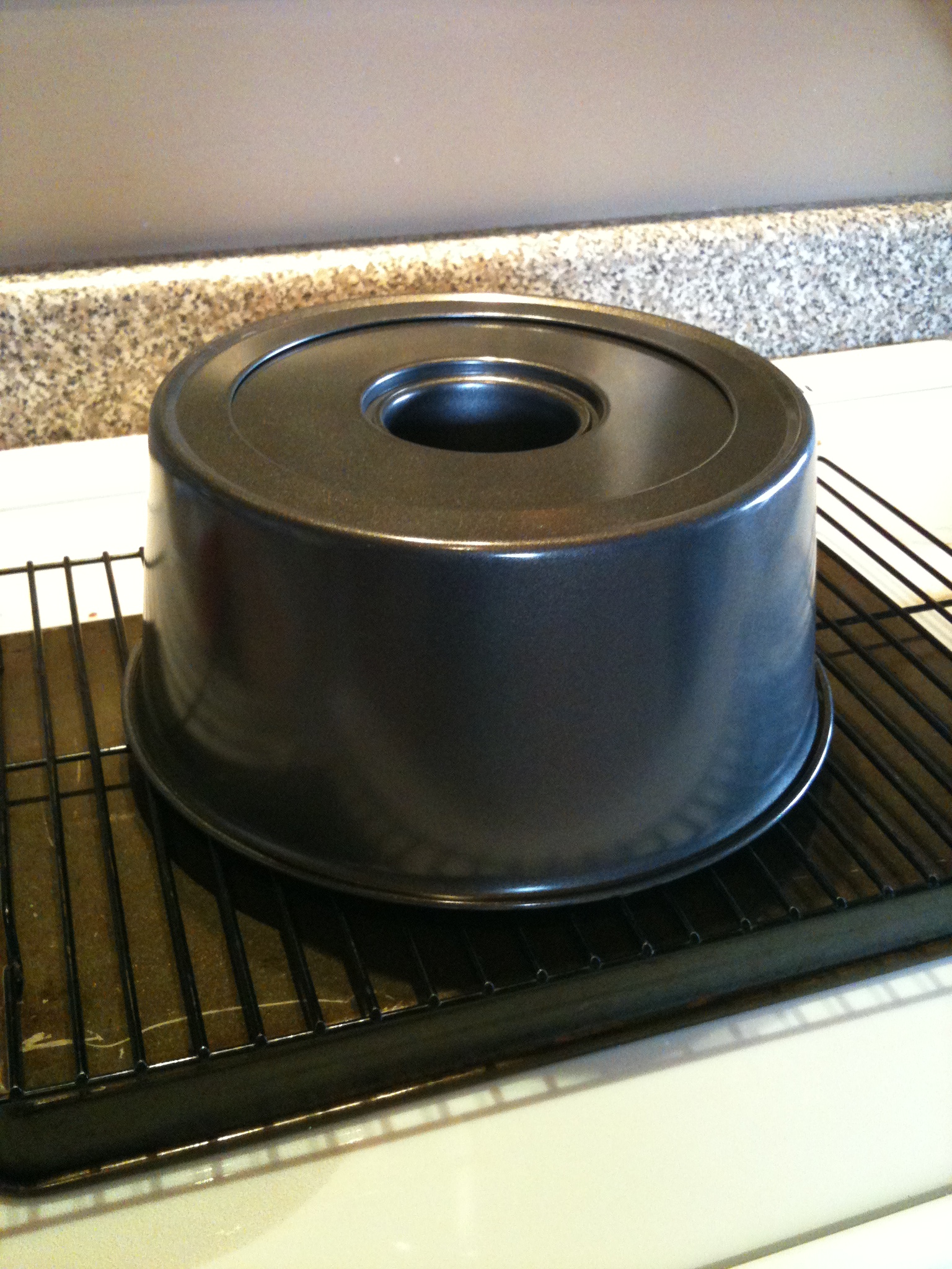 Once done, IMMEDIATELY invert cake onto funnel or whatever else you can find. Some newer pans have metal pegs that stick out just for this reason. Check your pan! Mine does not, so I just inverted it on a cooking rack. I’ve seen some people invert their pans on wine bottles or a soft drink bottle!