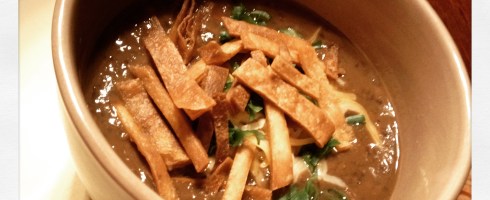 - Serve soup topped with cheese {again, omit cheese for vegan friendly}, green onions and crispy tortilla strips {or crumbs}. Not Vegan? – You could also add a tablespoon of sour cream or plain Greek yogurt!