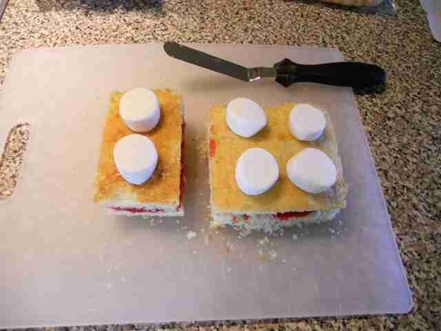 I lined one of our HUGE cutting boards with foil to hold the cake. Once all pieces were filled with the strawberry in the middle I put the cakes in the refrigerator to cool and “stiffen” up a bit {again, this makes it easier to frost}. Once cooled enough I laid out my bottom layer of the cake, leaving the smaller 2 pieces in the fridge. I lined up the two 8 pegged one’s and the one 6 and frosted them blue, red and yellow, then returned them to the fridge. I took out the 2 smaller pieces and frosted them blue and green {use whatever colors you like!}. I used big marsh-mellows cut in half for the peg part of the Lego’s and I did the smaller ones first because they would go on top. Now, you can either frost the marsh-mellows separate or frost them all together. I tried both ways and It seemed to be easier to frost them separate then add them on top then fix any areas that need touch up after.